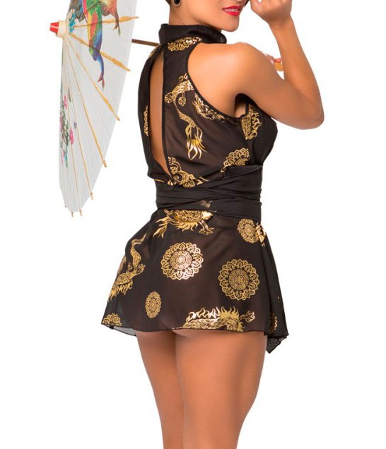 Fantasia Gueixa Jin Sapeka. Composta por robe, faixa, calcinha e palito de cabelo. Robe estilo quimono, com charmosa estampa oriental dourada. Decote na frente e costas, acrescentando um toque sensual à peça. Gola alta, abotoável, com acabamento em suave elástico viés. Faixa com espuma central, conferem melhor ajuste com extremo conforto. Calcinha fio dental com laterais elásticas finas, sem regulagem. Parte frontal com transparência na mesma estampa do robe. Palito de cabelo sugere coque para completar o visual. Composição: 100% Poliester.